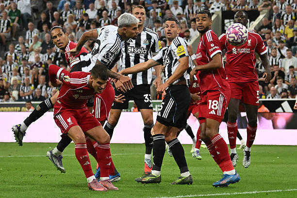 纽卡斯尔后场任意球,门将波普开大脚,这么一个简单的球,利物浦的防守跟小学生似的。